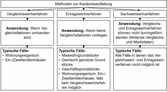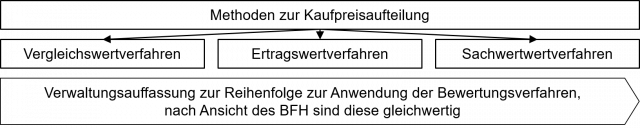 Nachdem die Verwaltung jahrelang das Sachwertverfahren zur Kaufpreisaufteilung bevorzugt hat, änderte das BMF jetzt seine Vorgehensweise. Seit einigen Jahren erfolgt die Bewertung je nach Gebäude- bzw. Objekttyp nach folgenden Verfahren: